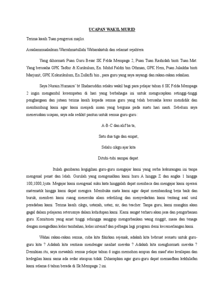 Ucapan Wakil Murid Jamuan Akhir Tahun Pdf